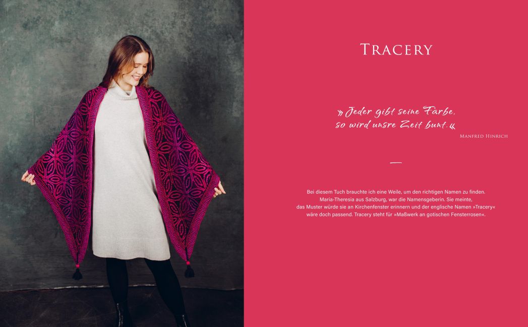 Bärbel Salet strickt, seitdem sie 12 Jahre alt ist, und ist seit jeher fasziniert vom Stricken mit vielen Farben und harmonischen Farbverläufen. Seit 2012 gibt sie regelmäßig Workshops darüber, wie man große, gemusterte Dreieckstücher plant und strickt. In ihrem Atelier (das gleichzeitig das Lager für ihren Onlineshop ist) findet man mittlerweile 365 verschiedene Farbtöne in Wolle.