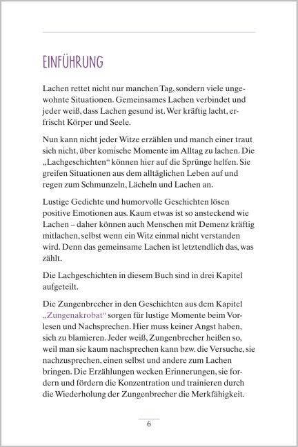 Heute wird gelacht! Mit den lustigen Geschichten und Gedichten zum Vorlesen liegen Sie bei älteren Menschen genau richtig: Die Geschichten rund um bekannte Zungenbrecher sorgen für heitere Momente beim Zuhören und Mitsprechen. Bei den humorvollen Gedichten bringen einfache Übungen für Körper und Geist zusätzlich Schwung in die Runde. Und bei den kurzen Geschichten rund um Alltagserlebnisse sind herzhafte Lacher garantiert. Jede Geschichte endet mit thematisch passenden Fragen. So können Sie ganz einfach eine heitere Gesprächsrunde einleiten. Und denken Sie immer daran: Lachen ist die beste Medizin!