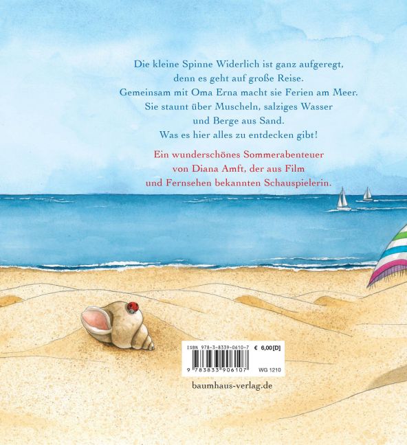 Die kleine Spinne Widerlich muss Koffer packen, denn es geht auf große Reise. Gemeinsam mit Oma Erna macht sie Ferien am Meer. Sie lernt Mats, die Matrosenspinne, kennen und staunt über Ebbe und Flut, Muscheln und Wattwürmer, salziges Wasser und Berge aus Sand. Sogar auf einen echten Leuchtturm darf sie klettern. Was es am Meer doch alles zu entdecken gibt! Ein zauberhaftes Ferienabenteuer von Diana Amft, der aus Film und Fernsehen bekannten Schauspielerin