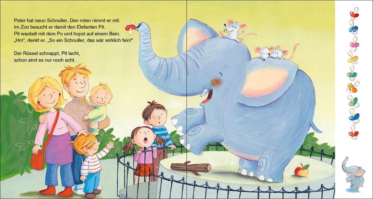 1, 2, 3 - sind Kinder schnullerfrei! Peter hat zehn Schnuller - und die braucht er alle unbedingt! Aber einen schnappt sich der Elefant im Zoo, einen tauscht Peter gegen ein Spielzeugauto, einen gräbt er ein ... und plötzlich hat Peter nur noch einen - und den schenkt er seiner kleinen Schwester. Denn Peter ist schon groß und Schnuller sind nur was für kleine Kinder! Auf jeder Doppelseite verschwindet ein Schnuller von der Leiste. So werden Kinder nicht nur ihren Schnuller los, sondern lernen auch blitzschnell die Zahlen von eins bis zehn.