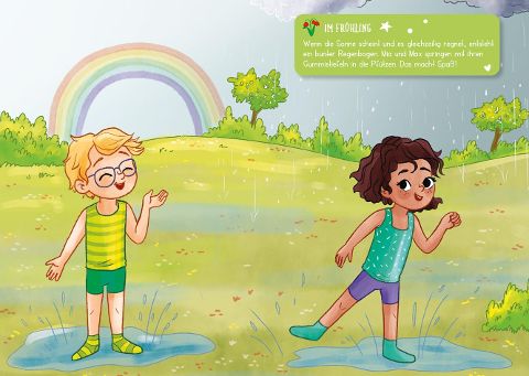 Mit Mia und Max durch die Jahreszeiten. Die beiden Kinder erleben im Jahresverlauf allerhand. Immer dabei: rund 150 bunte Sticker, die nach Lust und Laune auf- und umgeklebt werden können. Mit Gummistiefeln, kurzen und langen Hosen, Schneeanzug oder Badekleidung findet sich immer die passende Kleidung für jedes Wetter. Viele bunte Gegenstände wie Regenschirm, Wasserball, Eimer oder Schaufel lassen die Szenen lebendig wirken und bieten der Fantasie der Kinder viel Spielraum. Um die Sticker den richtigen Seiten im Heft zuzuordnen, helfen kleine Symbole. Dadurch können auch jüngere Kinder ab 4 Jahren eigenständig tolle Bilder kreieren.