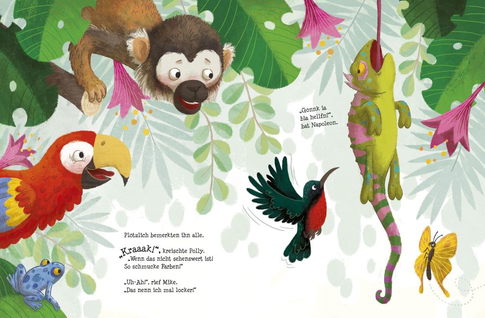 Im tiefsten Dschungel, auf dem schicksten Ast, lebt ein Chamäleon namens Napoleon. Napoleon ist eine schillernde Gestalt. Er ist mindestens so schick wie sein schicker Ast. Und genau das ist sein Problem. Denn Napoleon hätte so gern richtig gute Freunde. Doch egal ob er winkt, einen Willkommensgruß webt oder ein tolles Vogelbad für Papageiendame Polly anlegt - niemand bemerkt ihn. Bis eines Tages etwas passiert, das Chamäleons mindestens so gut beherrschen wie die perfekte Tarnung ...