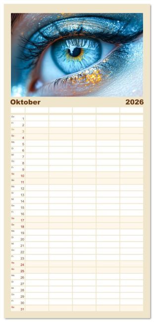 Man sagt, die Augen sind die Spiegel der Seele. Dieser Kunstkalender zeigt in atemberaubenden Makroaufnahmen die magische Schönheit der weiblichen Augen. Blaue und grüne Augen von Frauen werden in faszinierenden Nahaufnahmen der Iris und Pupillen eingefangen. Jedes Auge zeigt eine kreative Mischung aus Farbe und abstraktem Design, das durch KI generiert wurde. Die surrealen und futuristischen Darstellungen lassen den Augapfel fast lebendig wirken und versetzen den Betrachter in eine Welt voller Magie im Kalender. Der magische Kalender vereint digitale Kunst und Science-Fiction-Elemente in einem einzigartigen Konzept, das besonders Kunstliebhaber anspricht. Halten Sie jeden Monat einen Augenblick inne und genießen Sie den Eyecatcher in Ihrer Wohnung. Eine tolle Geschenkidee als Mitbringsel.