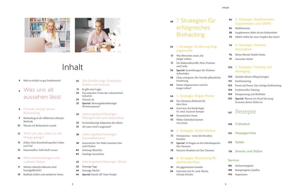 Hinweis zur OptimierungImpressumZur AutorinWichtiger HinweisDieses Buch ist genau richtig für dich, wenn ...Willst du so bleiben, wie du bist? Du darfst!Das sind meine Top-10-Biohacking-LebensmittelWeil es einfach so gut funktioniert!Was uns alt aussehen lässt7 Strategien für erfolgreiches BiohackingRezepte7 Strategien für deine VerjüngungDr. med. Meike Diessner