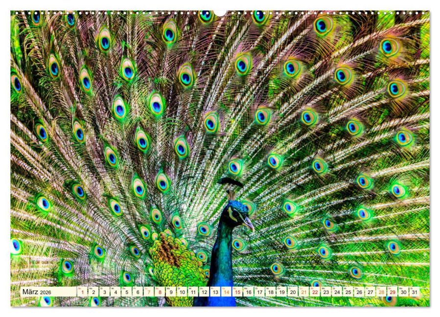 Der Pfau - einer der ältesten Ziervögel der Menschen.. 4. Edition 2025. 42,5 cm / 59,4 cm / 1,0 cm ( B/H/T )