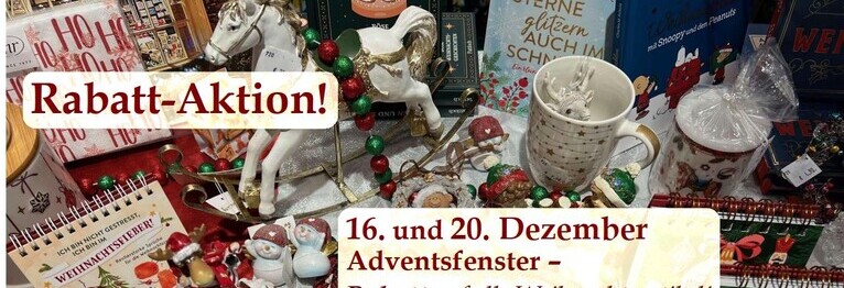 Auf dem Lindenhof bieten Geschäfte und Institutionen des Gewerbevereins unter dem Thema "Adventsfenster" an ausgewählten Tagen Aktionen an. Wie der Name schon andeutet, werden zusätzlich auch Schaufenster und Räume passend zur schönen Adventszeit geschmückt. Am Dienstag, 16.12. und Samstag, 20.12. gibt es 10-20 % Rabatt auf alle Nonbook-Weihnachtsartikel.