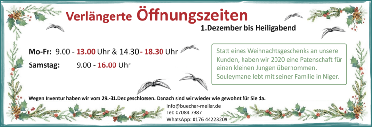 Außerdem stellen wir sowohl im Laden, als auch im Außenbereich Kundenmagazine wie Lesart, buch-aktuell, Taschenbuchmagazin, sowie Regionales zur Verfügung. Eine große Pinnwand und das Flyer-Regal im Eingangsbereich informieren über Veranstaltungen und Angebote in Schömberg und Umgebung.